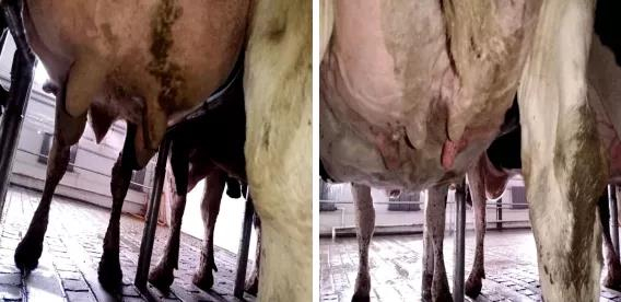 這是該牧場清潔前后乳頭情況的一個對比,可以很清楚地看到,使用小旋風(fēng)乳頭刷后,奶牛乳頭的衛(wèi)生狀況有了很大的改善,同時可以看到乳頭充盈度明顯提高,乳頭皮膚沒有任何損傷。
