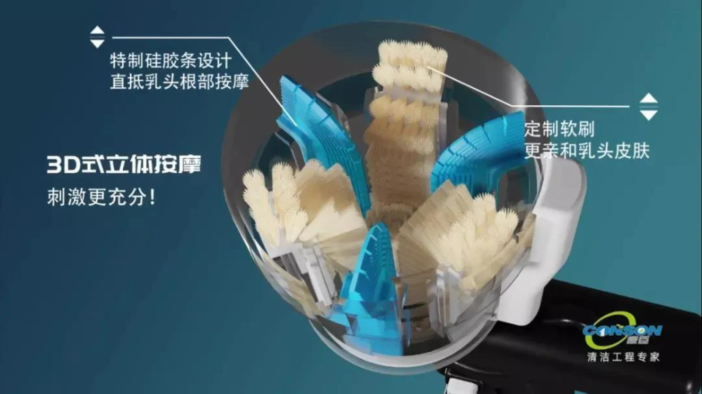 但小旋風(fēng)的出現(xiàn),最大限度地解決了這個問題!首先,小旋風(fēng)創(chuàng)新性地引入了渦流式清洗的概念設(shè)計——單向旋轉(zhuǎn)方式,讓刷條圍繞乳頭中心旋轉(zhuǎn),讓整個乳頭刷內(nèi)的水流形式以乳孔刷軸線為中心的渦流,乳頭無壓力清洗,并且在清潔過程中,奶牛乳頭可以更全面地與藥浴液和水流接觸,更有效地清潔和保護奶牛乳頭。與此同時,小旋風(fēng)乳頭刷刷頭所采用的是硅膠材質(zhì),對肌膚更加柔和,從而更好的保護乳頭皮膚;而且刷杯底部配有專門的刷毛對乳孔進行清潔。這樣一來,從乳頭根部到乳頭壁,再到乳頭孔,不僅能夠360度全包裹清潔,而且能有效解決刷條對奶牛乳頭的壓迫問題,達到無損清潔。讓奶牛乳頭進行高效清潔的同時,得到一份舒適的呵護!