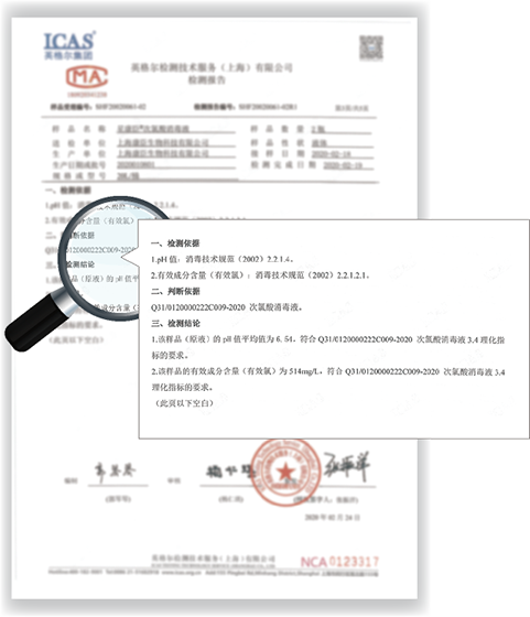 1.該樣品(原液》的pH值平均值為6.54,符合Q31/0120000222CO09-2020次氯酸消毒液3.4理化指標的要求。 該樣品的有效成分含量〈有效氯)為514mgL,符合Q31/0120000222C009-2020次氯酸消毒液2-3.4理化指標的要求。 |